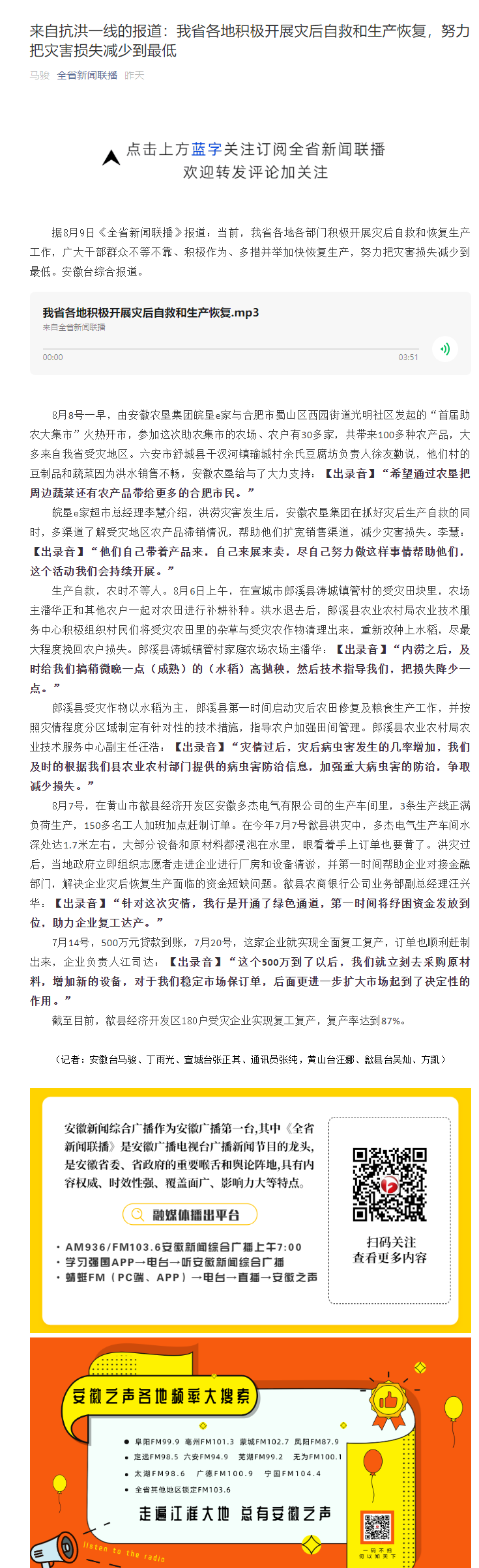 安徽新闻广播全省新闻联播:我省各地积极开展灾后自救和生产恢复,把灾害损失减少到最低
